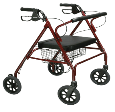 3. A four-wheeled walker (rollator) – least stable because of the wheels. It is ideal for someone with arthritis, a respiratory disease, or congestive heart failure. Its seat allows the user to rest when needed and is easier to navigate with because of the four-wheeled design. The problem is people with low grip strength or other impairments may have difficulty braking the device.