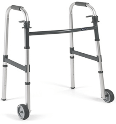2. A two-wheeled walker – less stable than the standard walker, user has a more natural gait, and does not need to be fully lifted off the ground