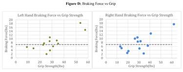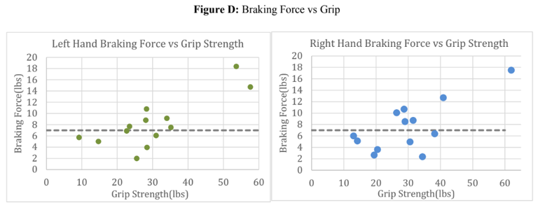 The grip strength and braking force data demonstrated the necessity of an assisted braking system. The ATBS applied over twice the force of the manual braking system, ensuring greater and more consistent braking performance. In contrast, the manual system's effectiveness was limited by grip strength, fatigue, and ergonomic challenges related to handle design. Given that the average grip strength for individuals over 65 is below 65 lbs. for men and 46 lbs. for women, many older adults may struggle to apply sufficient force to stop the rollator effectively.