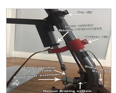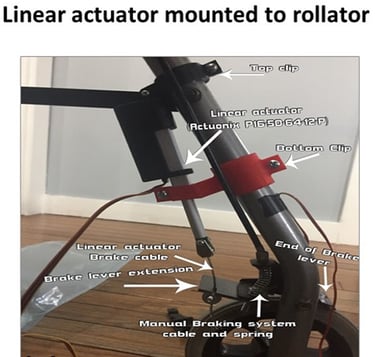 The ATBS was designed to replicate the function of a manual brake lever by applying an upward force using a linear actuator. This actuator was mounted on the rollator frame using custom 3D-printed mounting clips, which were designed in SolidWorks™. The actuator was connected to the brake lever via a braking cable and powered by a 12V, 6Ah battery, which also supplied power to the sensors and control system. A custom brake lever was designed to replace the original lever to improve braking efficiency and accommodate force measurement strain gauges for real-time force monitoring.