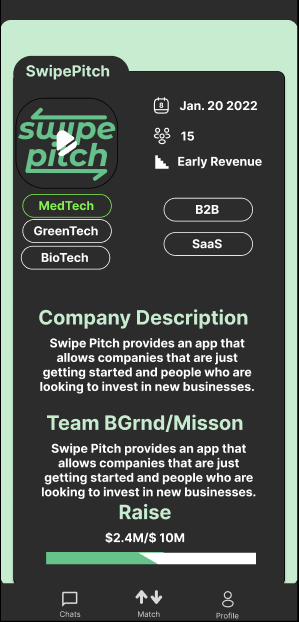 SwipePitch is the easiest way for startups and investors to discover each other. Our mission is to remove friction from early-stage investing and make startup discovery intuitive, fun, and data-driven.